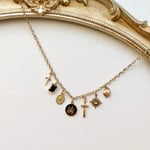 An 18” gold plated stainless steel cable chain decorated with 7 gold plated charms. Chain also has a 2” chain extender.