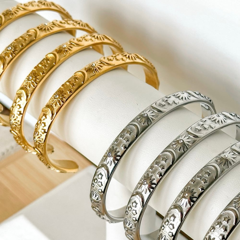 A stainless steel celestial cuff bracelet in gold and silver. Measures to fit approximately 7” wrist.