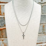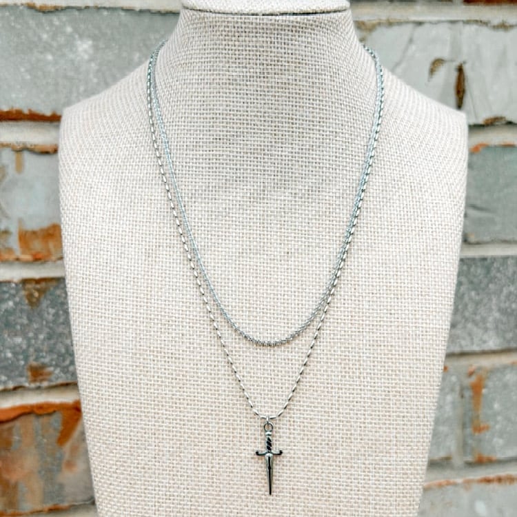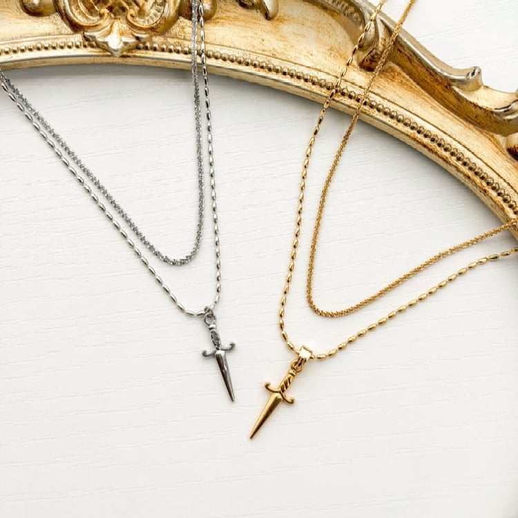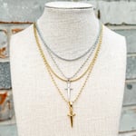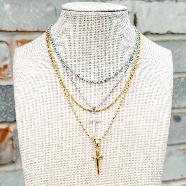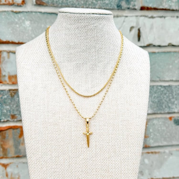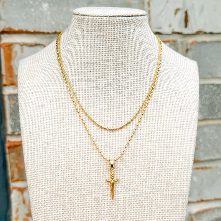 16” - 19” stainless steel/gold plated stainless steel double layered chain decorated with a stainless steel sword pendant.