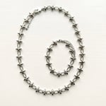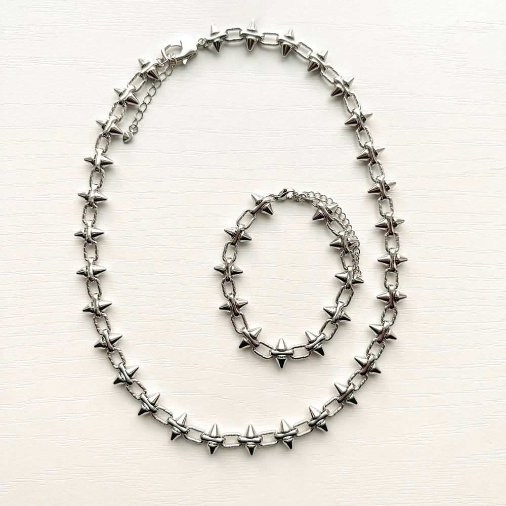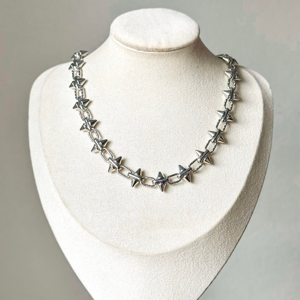 A 12.8mm silver plated spiked link chain measuring 18” plus a 2” chain extender.