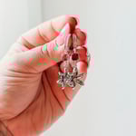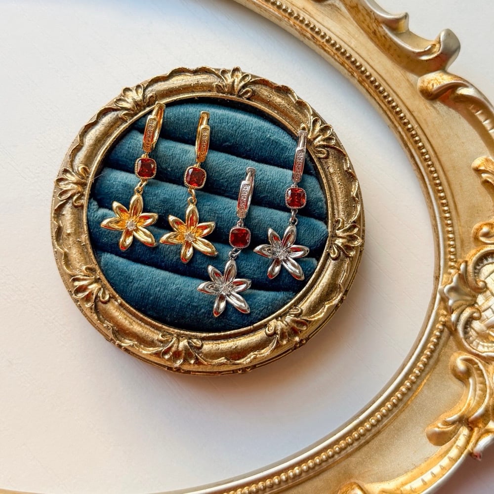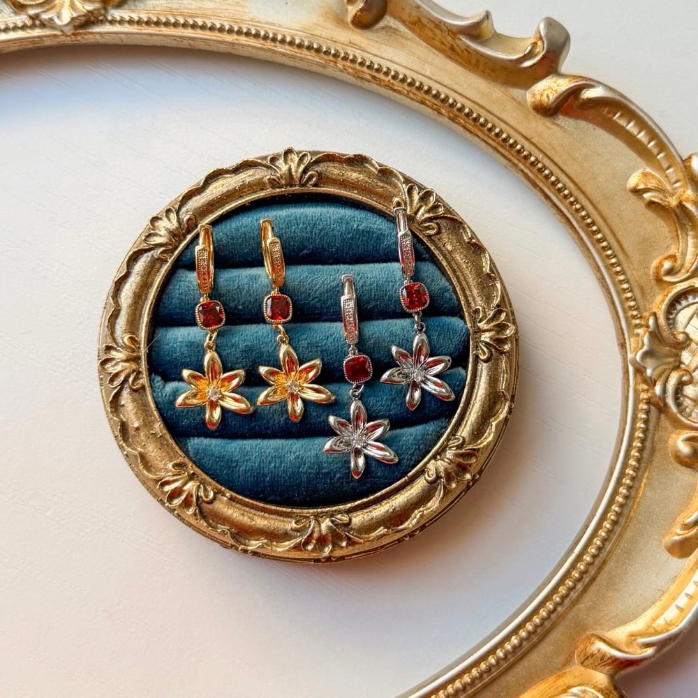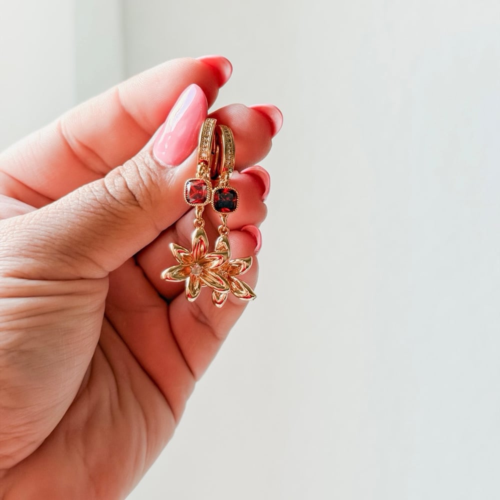 Gold plated/silver plated cubic zirconia huggie earrings decorated with red cubic zirconia connector charms and plated flower charms.