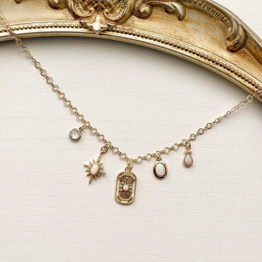 A 17” gold plated hammered chain decorated with 5 lab opal/opalite charms and a 2” chain extender.