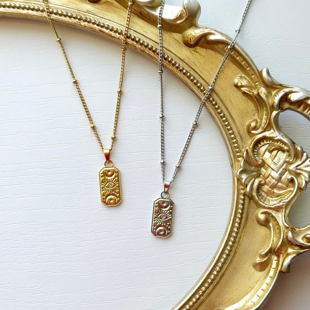 A 17” stainless steel beaded satellite chain with a 3” chain extender, decorated with a stainless steel protective celestial pendant.