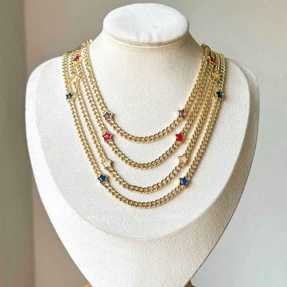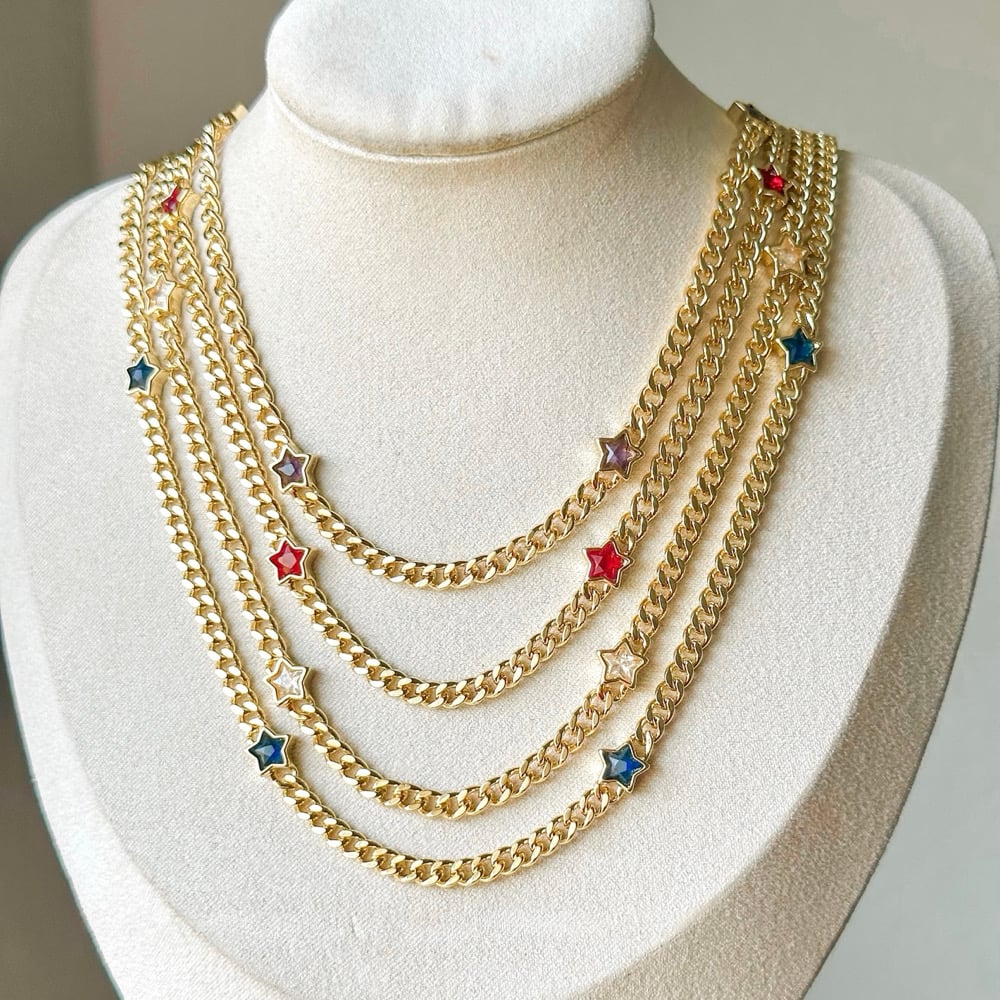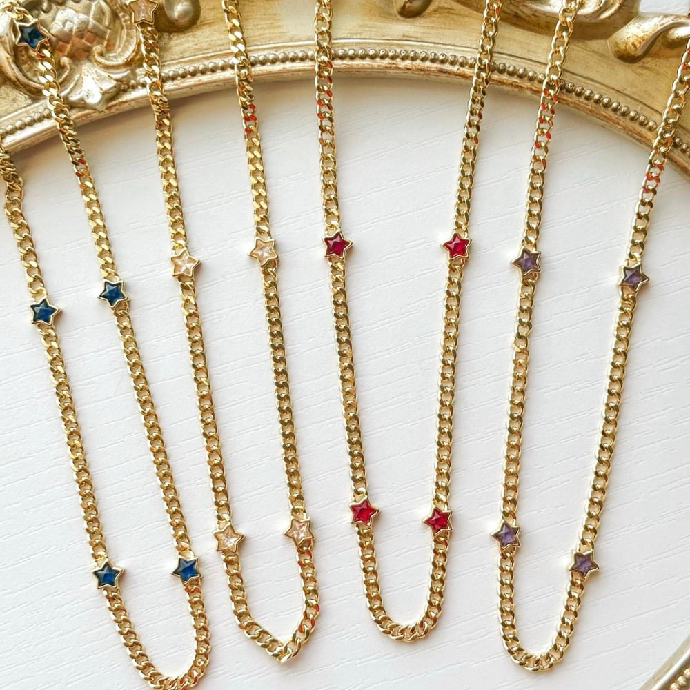 An 18.5” gold plated curb chain decorated with colored stars along the chain. Necklace has a 1.5” chain extender.
