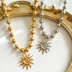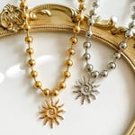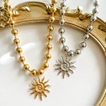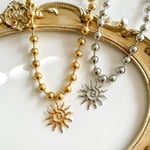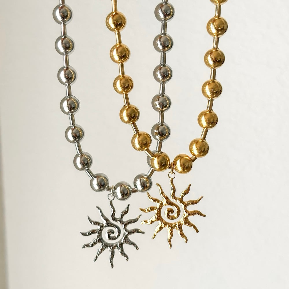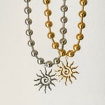 A 19” stainless steel beaded metal chain decorated with a stainless steel sun pendant. Measures 19” with a 3” chain extender.