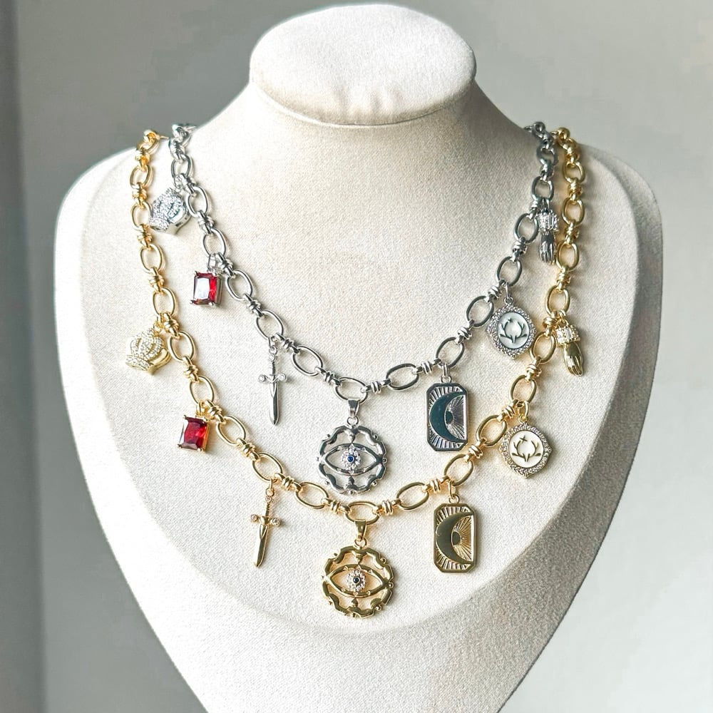 A crown, a red cubic zirconia, a dagger, an eye focal pendant, a rectangular moon, an antler charm, and a cubic zirconia decorated hand.