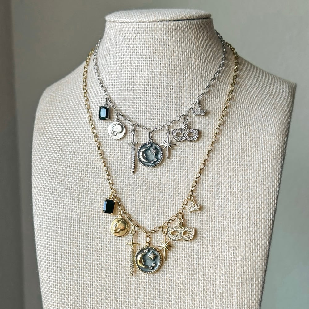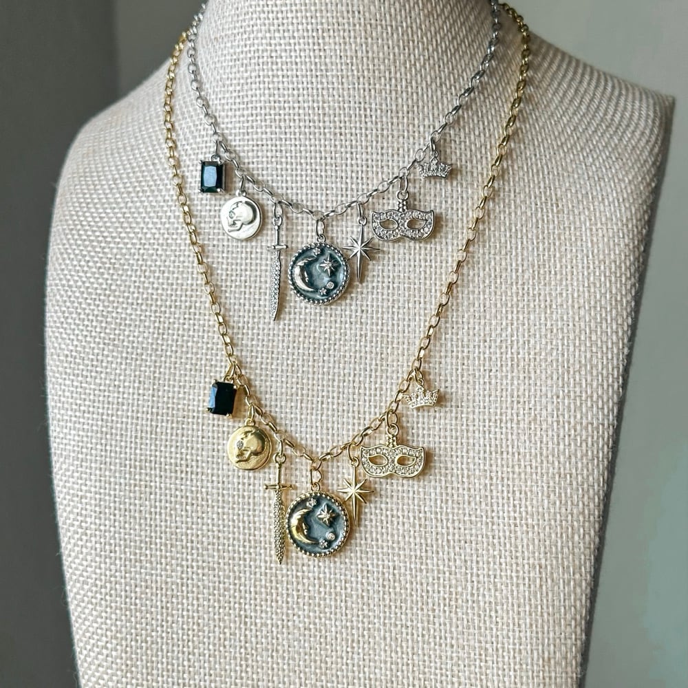 The charms from left to right are a black cubic zirconia square charm, a skull charm, a sparkly cubic zirconia sword charm, a moon and stars focal pendant, an 8 pointed star charm, a sparkly cubic zirconia mask charm, and a sparkly cubic zirconia crown charm.