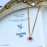 An 18.5” gold plated scroll chain decorated with a 13.7mm gold plated red eye pendant with a carnelian stone.