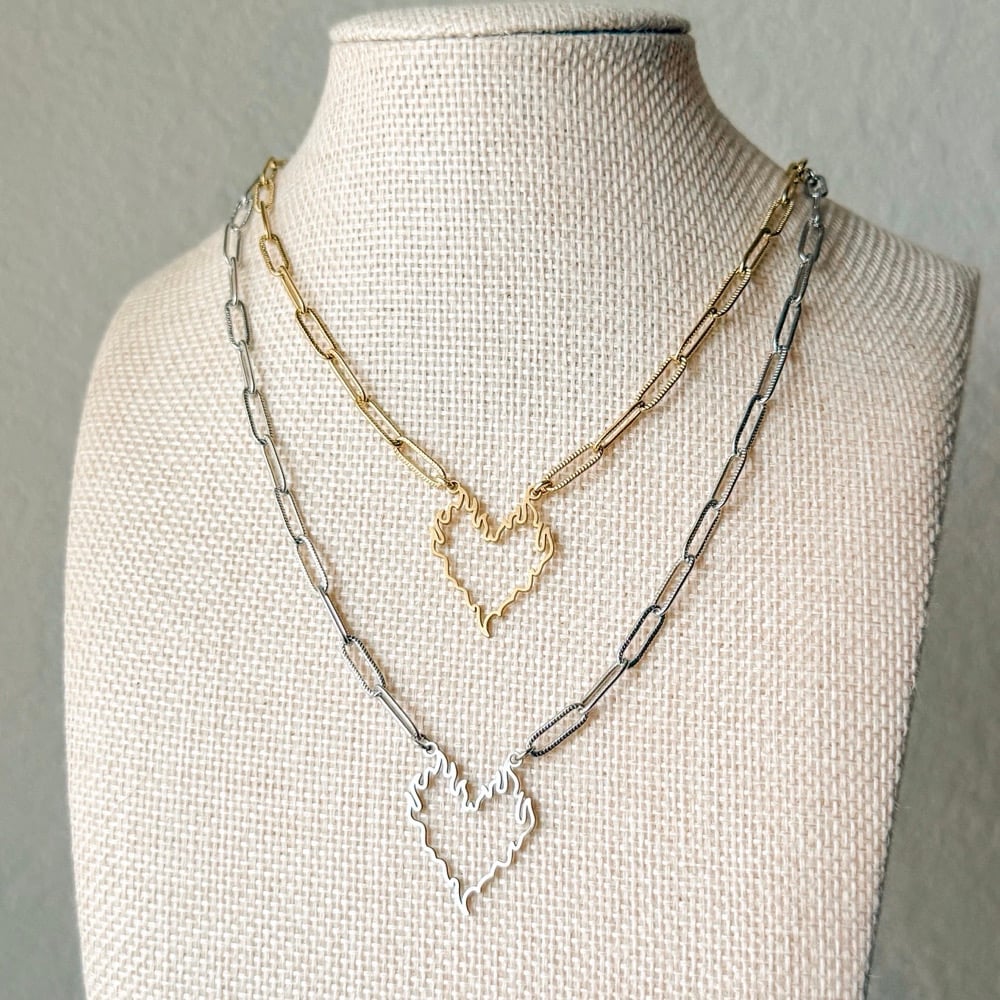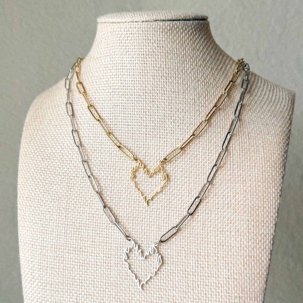 An 18” stainless steel textured paperclip chain decorated with a stainless steel heart on fire pendant and a 2” chain extender.