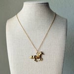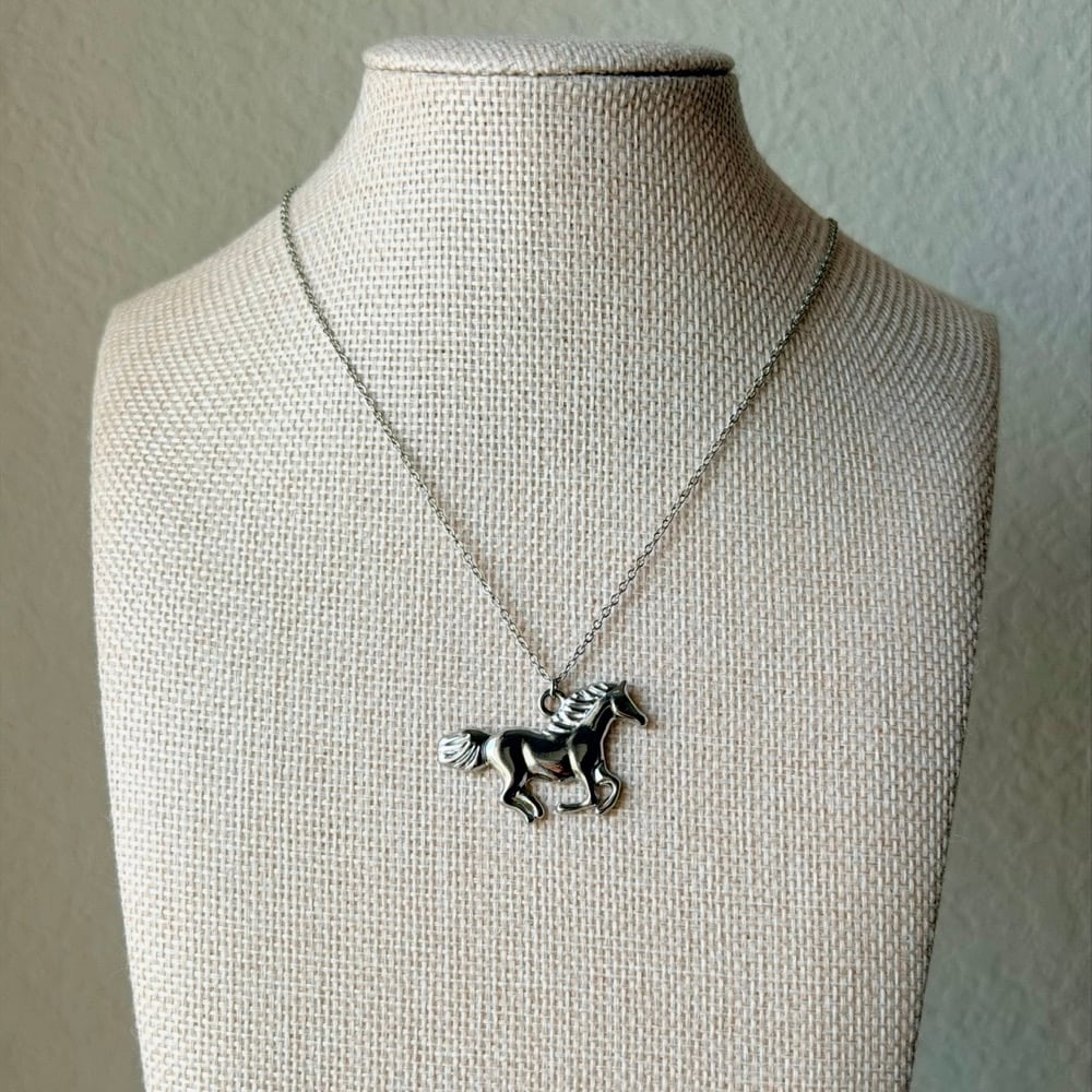 An 18” stainless steel cable chain decorated with a stainless steel horse pendant and a 2” chain extender.